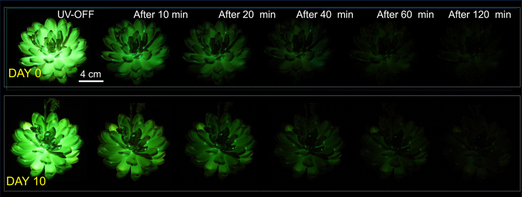 Eso sí, este brillo no dura toda la noche. En el experimento, realizado con una especie de Echeveria, el resplandor duró aproximadamente 120 minutos, es decir, unas 2 horas. Además, pudieron activar esta luminiscencia de forma repetida durante los 10 días que duró la prueba. Después de esos 10 días, no he podido encontrar qué ocurrió con el brillo.