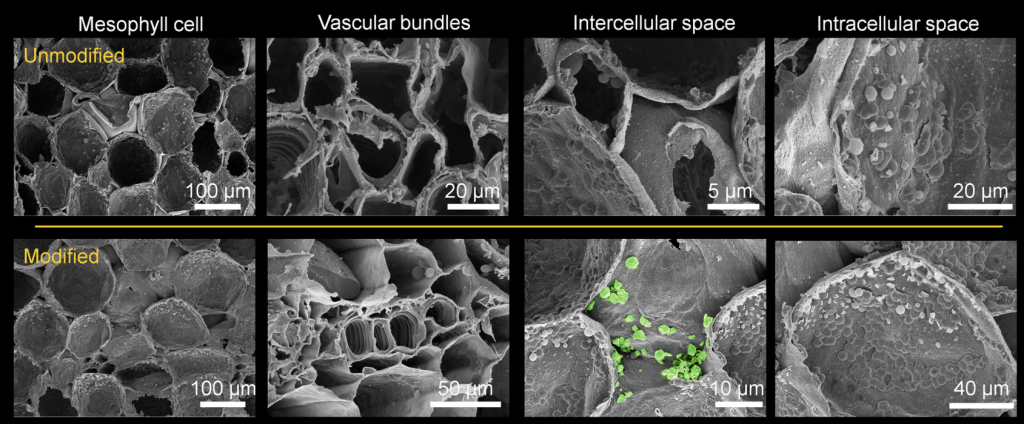 Cuando se inyectó demasiado volumen de suspensión, sí se produjeron daños, ya que la presión interna de las hojas aumentó en exceso. Sin embargo, cuando el volumen fue el adecuado, no hubo diferencias significativas en comparación con la muestra de control. Se observó que las partículas de fósforo quedaban en los espacios intercelulares y no pasaban a los haces vasculares, probablemente debido a su tamaño. Esta es una observación a corto plazo, faltan estudios que consideren cómo afecta el crecimiento de la planta a estas partículas de fósforo.